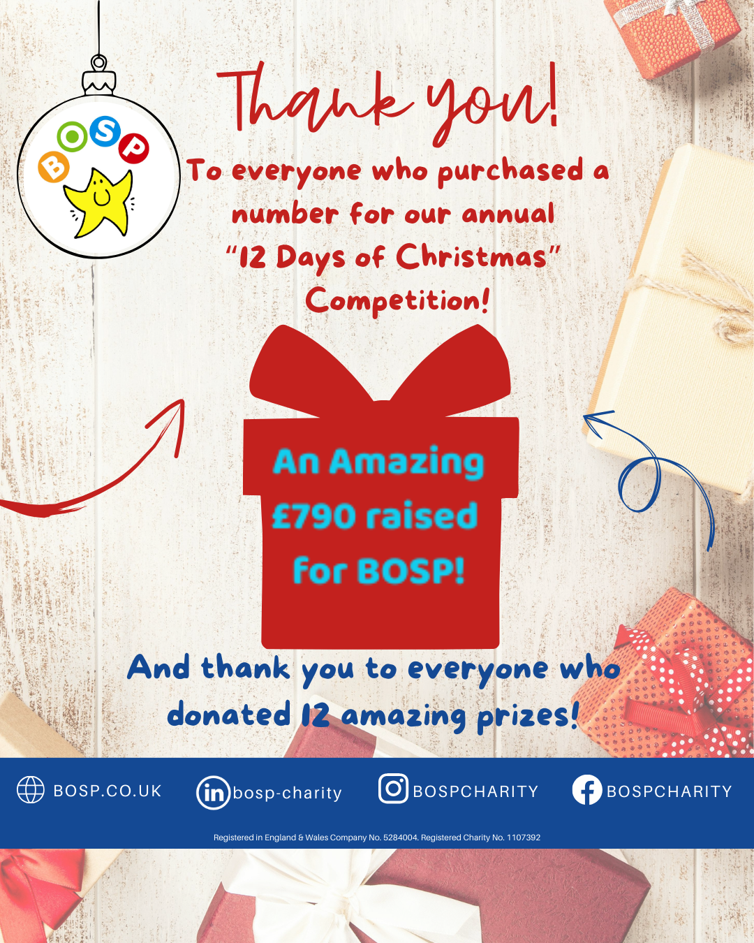 In December, our wonderful supporters entered our 12 Days Of Christmas competition, and raised an incredible £790 for BOSP! Thank you to everyone for their generosity over Christmas.